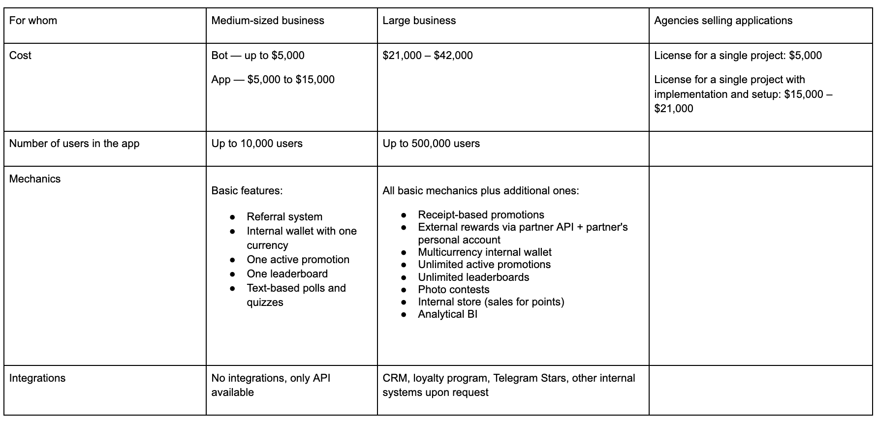 We create the project. We develop both core and additional features. We also assist with audience engagement and partnerships, as cross-app activities and traffic exchange are popular in Telegram mini-apps.