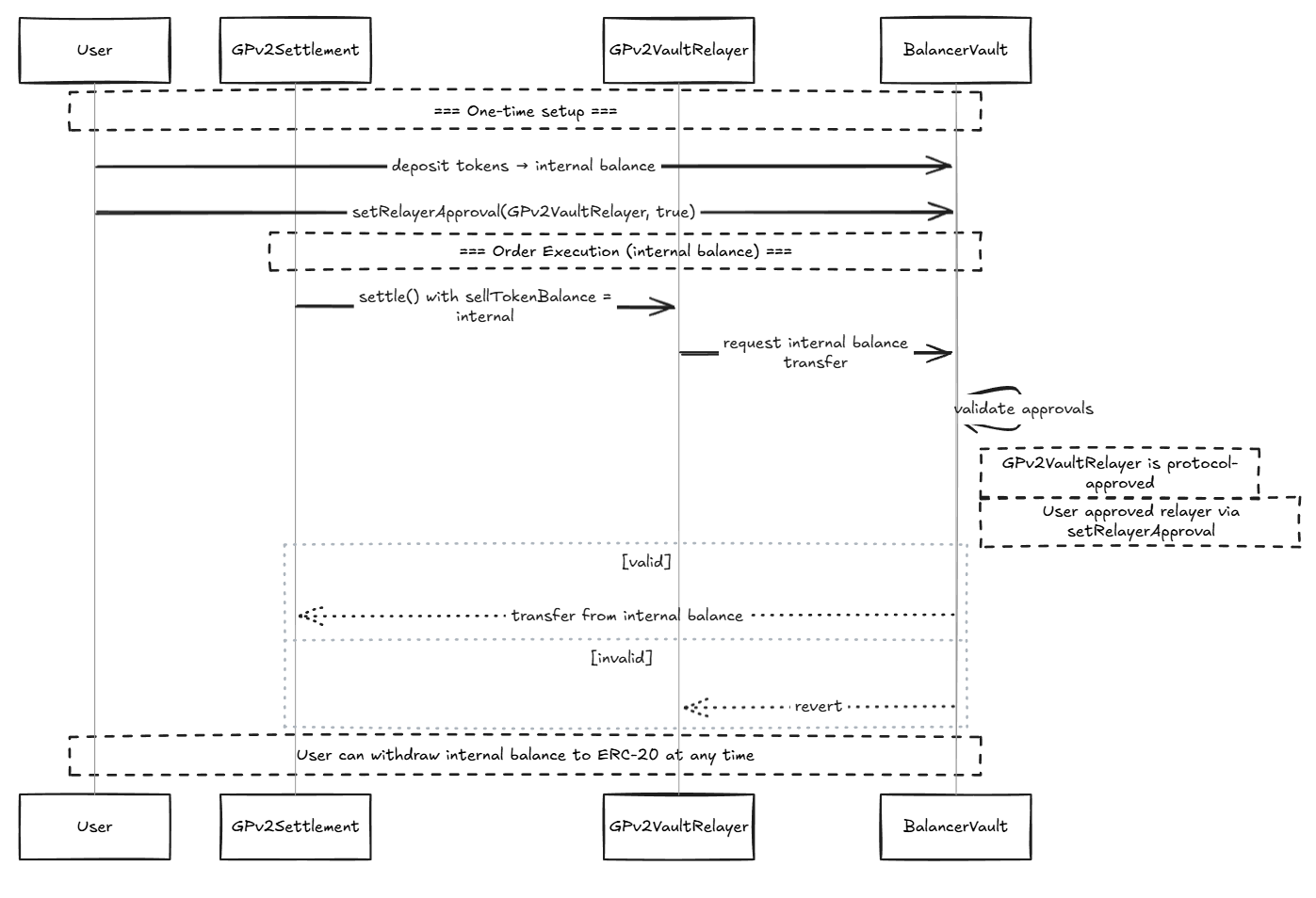 approve calls made directly to the GPv2VaultRelayer address (explained earlier)  - External Balancer balances – Uses the user’s existing ERC-20 approvals for the Balancer Vault
