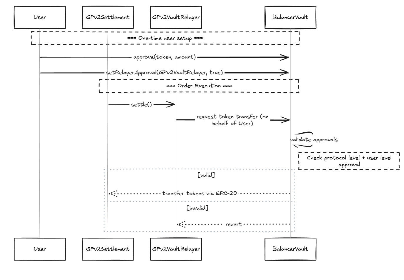 It’s important to note that the key element of this partnership is the GPv2VaultRelayer contract, which serves as a critical security component. Its main guarantee: GPv2VaultRelayer can transfer ERC-20 tokens ONLY to the GPv2Settlement contract.