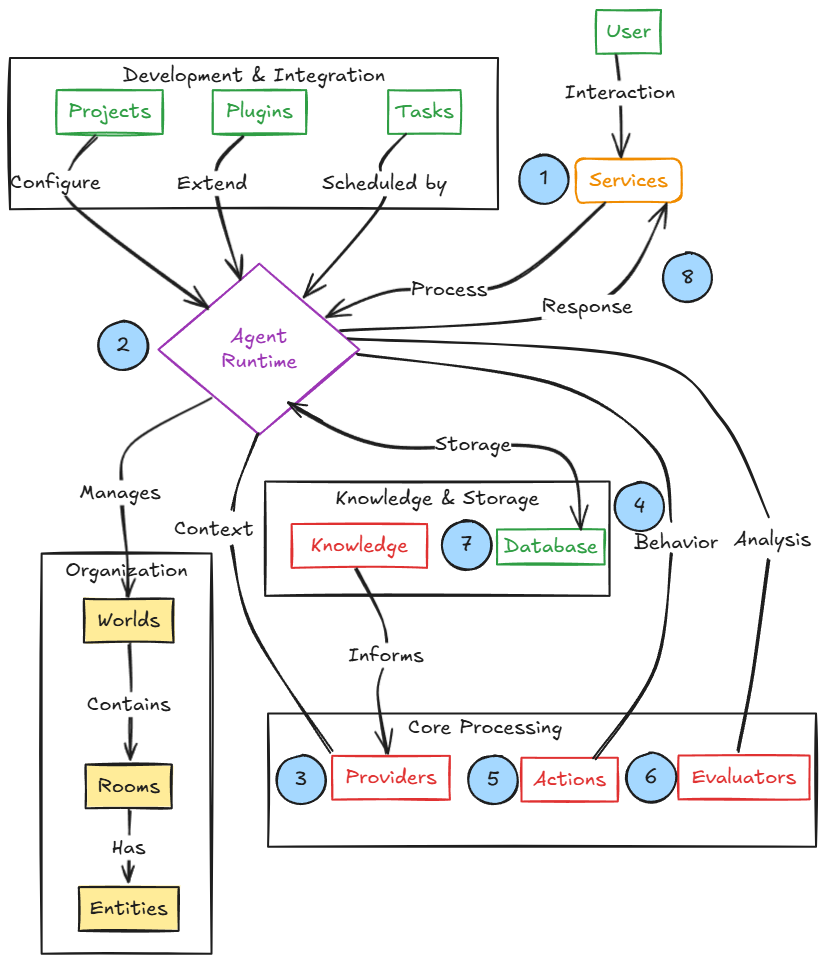 - Services — This component connects agents to external services. Essentially, it’s the entry point for communication with agents. For example: Discord, X, Telegram.