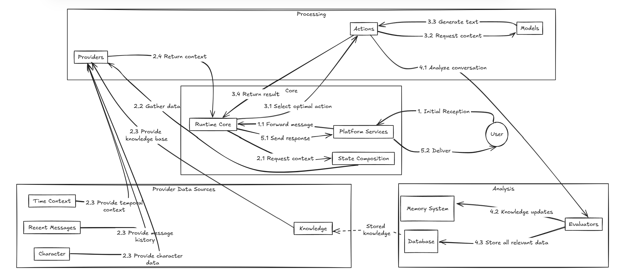 - Service Reception: The user sends a message via a platform (e.g., writes in a Discord chat or sends a message in Telegram), and the agent receives it