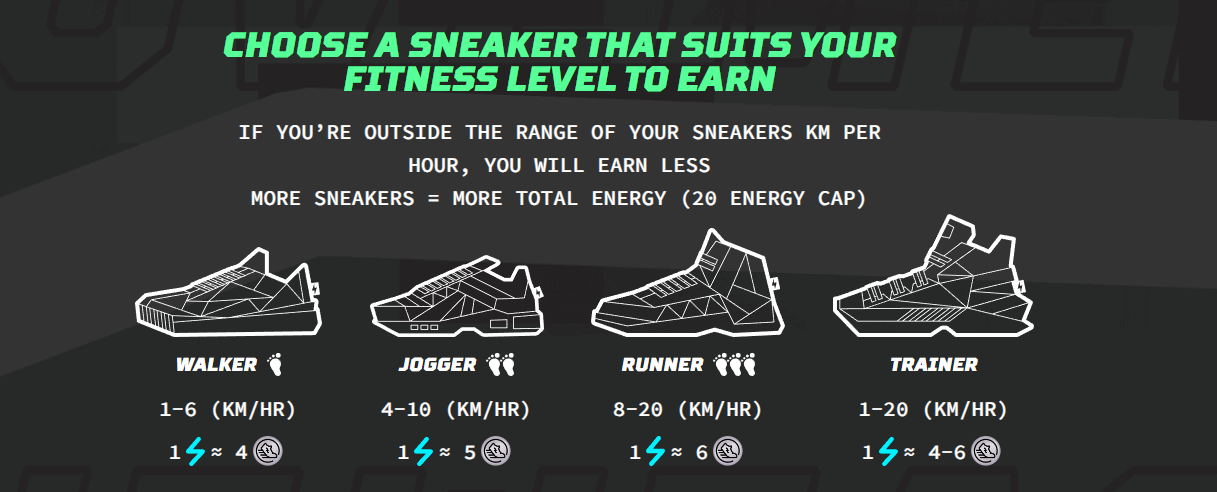 There are different types of sneakers: Walking, Jogging, Running, and Trainer. Each category is adapted to a specific activity level. The attributes Efficiency, Luck, Comfort, and Resilience affect the profitability and wear of the sneakers. Energy limits the number of rewards per day, while quality determines the sneakers' potential and earnings. GPS and internet signal influence income stability.