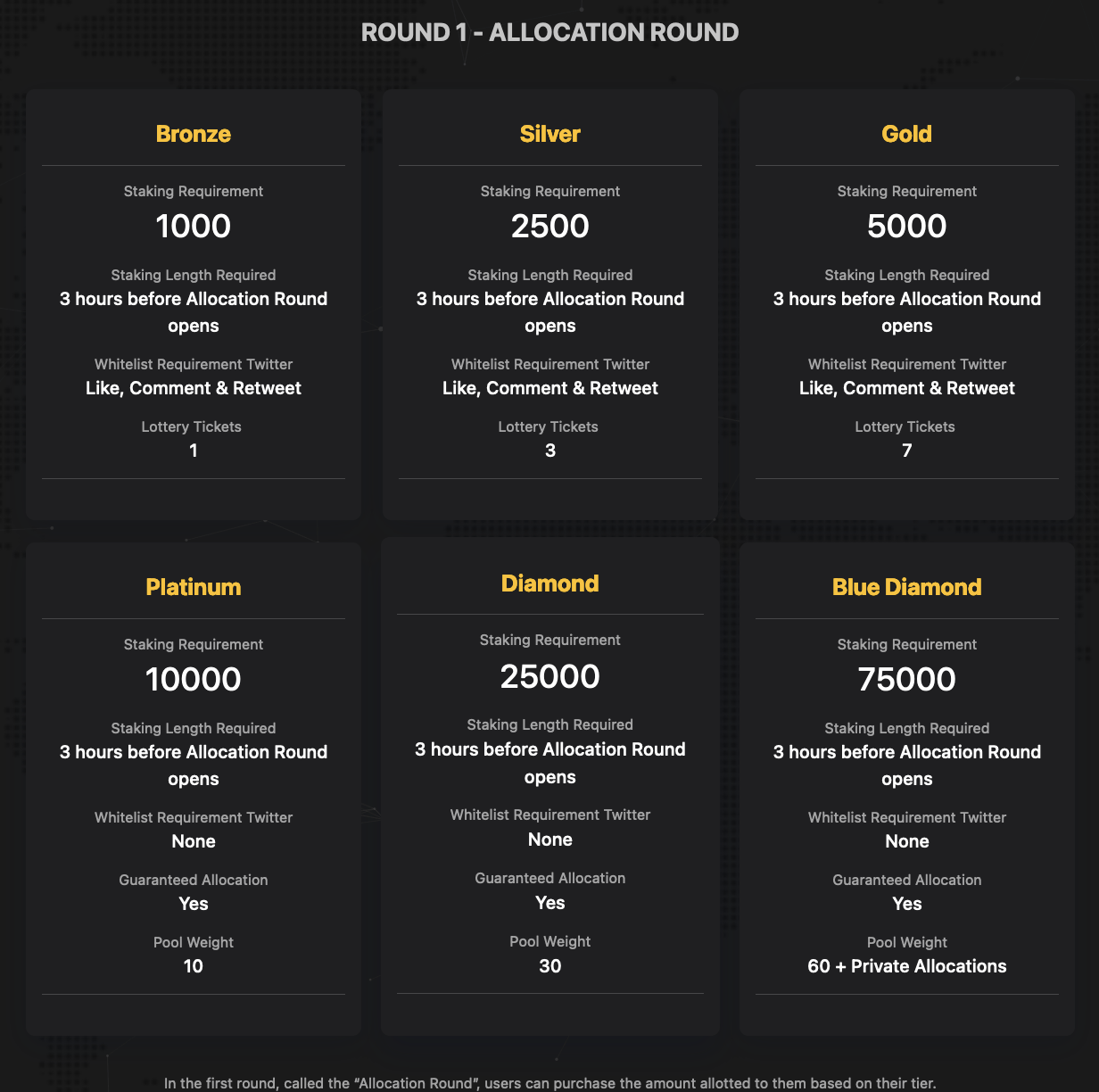 BSCPad is known for its special two-round project asset allocation system. In the first round, all users are guaranteed to receive tokens in direct proportion to their status and the amount of BSCPAD they hold. In the second round, all tokens remaining after the first round are sold on the basis of the FCFS (First Come First Serve) principle only to investors of guaranteed levels (this is Platinum and above). The amount of tokens they can purchase is determined by a formula based on their level. The second round is open until all tokens have been sold (usually a matter of a few minutes). IDO ends when all tokens are sold.