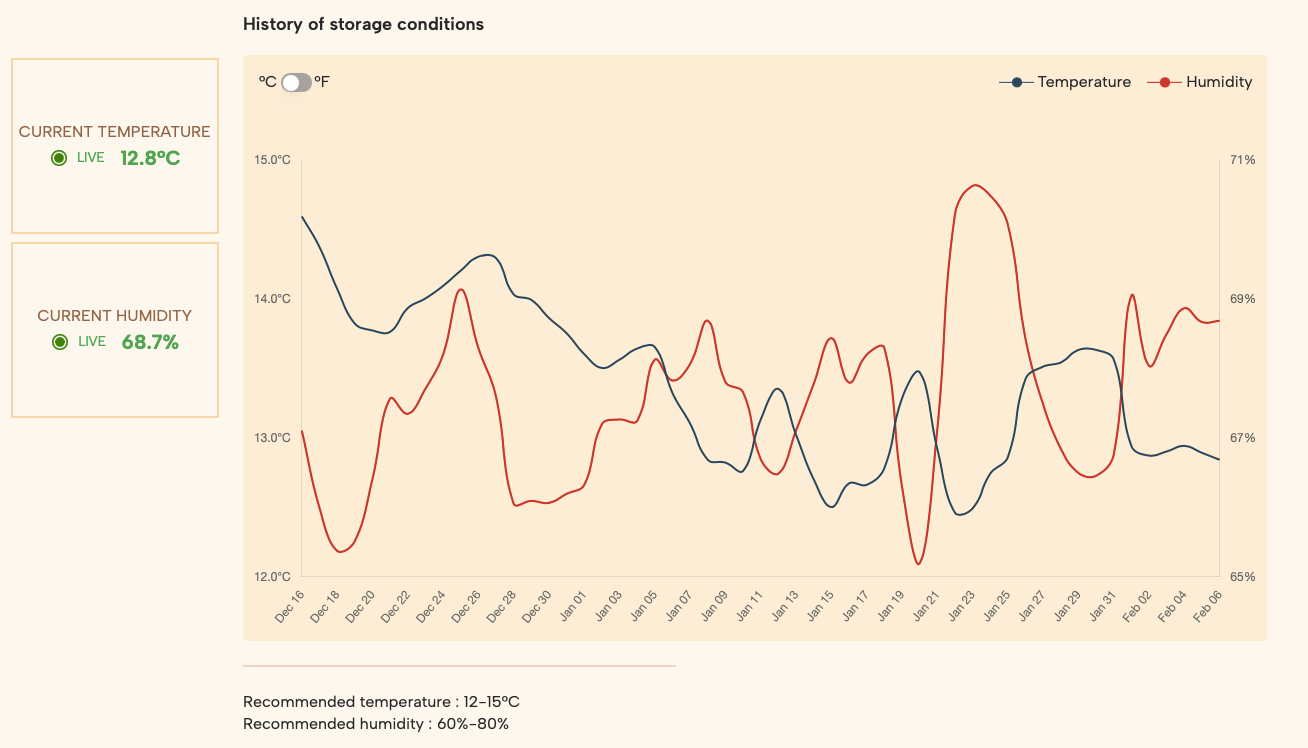 Control over storage conditions. It's challenging for collectors to monitor the temperature and humidity of wine cellars and ensure their beverages are safe. Therefore, platforms selling tokenized drinks allow buyers to monitor storage conditions in real-time. Typically, on the product page, you can see the current temperature and humidity in the wine cellar and how these metrics have changed over the storage period.